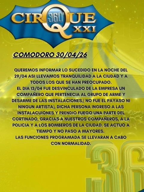 La empresa Cirque XXI emitió un comunicado oficial para llevar tranquilidad a la comunidad de Comodoro Rivadavia tras el principio de incendio registrado durante la noche del 29 de abril en sus instalaciones.