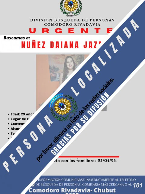 La División Búsqueda de Personas de Comodoro Rivadavia informó que ya fue localizada D.. Agradecieron a la comunidad por difundir y colaborar.