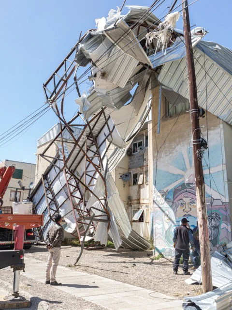 Tras el violento temporal de viento que azotó a la región este lunes, con ráfagas que superaron los 150 km/h, se intensificaron las tareas de emergencia, poniendo el foco en la remoción de la estructura metálica que se desprendió de un edificio en el barrio 30 de Octubre (conocido como las 1008 Viviendas).