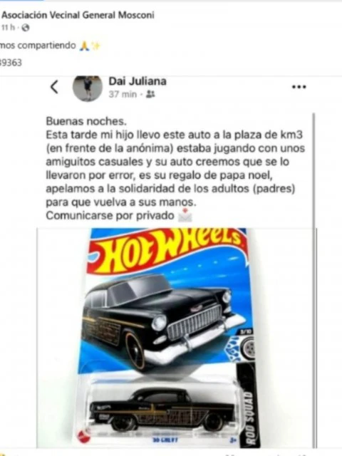 Desde la Asociación Vecinal General Mosconi también compartieron el pedido, invitando a quienes puedan tener información a comunicarse de manera privada para facilitar la devolución del juguete.