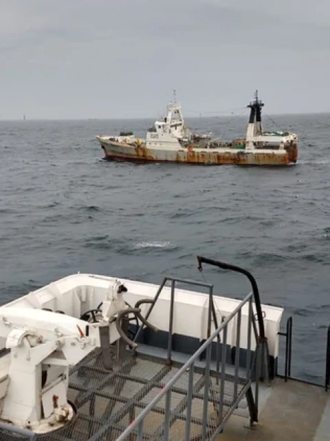 El procedimiento comenzó esta mañana, poco antes de las 8, cuando la tripulación del guardacostas realizaba tareas de patrullaje y vigilancia marítima y detectó pescando ilegalmente al pesquero Calvao, de bandera portuguesa. De inmediato se inició el procedimiento de detención. Inicialmente, la nave portuguesa no acató las órdenes y siguió navegando con sus redes en el agua en dirección a aguas internacionales. Así, mientras huía, seguía pescando.