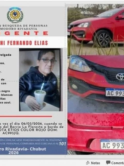 De acuerdo con los datos aportados, el hombre se moviliza en un vehículo Toyota Etios color rojo, dominio AC 993 JQ, con el que habría salido la noche en que fue visto por última vez.