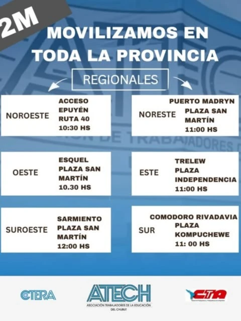 Gremios docentes convocan a marchas en toda la provincia de Chubut en el marco del paro nacional. Puntos de concentración, reclamos y cómo impacta en las clases.