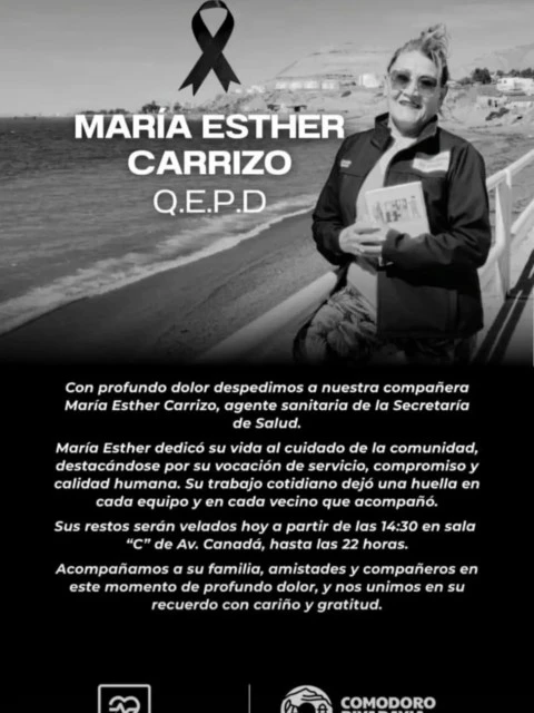 La ciudad de Comodoro Rivadavia atraviesa horas de profundo pesar tras el fallecimiento de María Esther Carrizo, trabajadora de la Secretaría de Salud y referente en el trabajo territorial. Su muerte impactó especialmente en el ámbito sanitario y en vecinos de la zona norte, donde desarrollaba tareas comunitarias.
