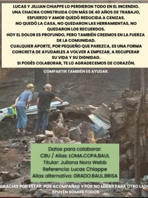 El avance del fuego en Epuyén dejó una de sus postales más dolorosas: la pérdida total de la casa y la chacra de Lucas Chiappe y su esposa Jillian Webb, un espacio construido durante décadas con esfuerzo personal, investigación y compromiso con el ambiente. Amigos y vecinos impulsan una campaña solidaria para ayudarlos a reconstruir lo perdido.
