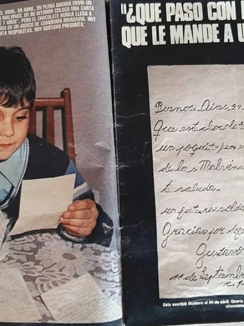 En 1982, Gustavo Vidal tenía apenas 7 años. Como miles de chicos argentinos, donó un chocolate para los soldados. Por sugerencia de su madre, escondió una carta entre el papel de aluminio y el envoltorio: "Que este chocolate te endulce en esos días fríos de Malvinas. Gracias por defender mi patria. Te saluda, un futuro soldado de siete años".