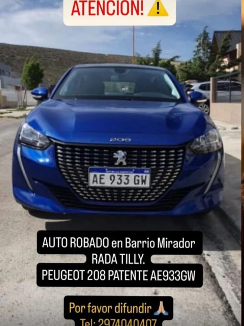 Durante las últimas horas se registró el robo de un automóvil en el barrio Mirador de Rada Tilly, luego de que personas desconocidas ingresaran a una vivienda y sustrajeran distintos elementos, entre ellos la llave del vehículo, que se encontraba guardada en un cajón.Con esa llave, los delincuentes se llevaron un Peugeot 208, color azul, patente AE 933 GW, que pertenece a la familia damnificada.