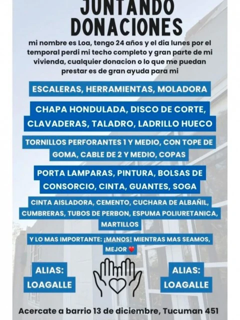 Ante el escenario de emergencia, Loa inició una campaña solidaria para reunir materiales y manos dispuestas a colaborar en la reconstrucción del hogar. La familia solicita el aporte de vecinos, comercios y empresas que puedan contribuir con insumos o herramientas esenciales para poder volver a levantar la vivienda.