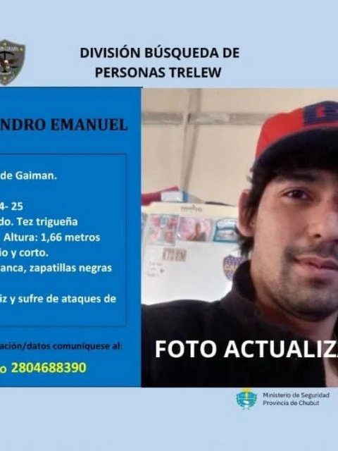 Emanuel Centeno, de 28 años y oriundo de Gaiman, está desaparecido desde el 23 de mayo. En las últimas horas, un camionero que transitaba por la Ruta 3 aseguró haberlo visto en una estación de servicio de Comodoro. Esto activó un nuevo despliegue de búsqueda, con rastrillajes en Comodoro Rivadavia, especialmente en zona norte, Kilómetro 8, barrio Palacios y la vereda Ítalos.