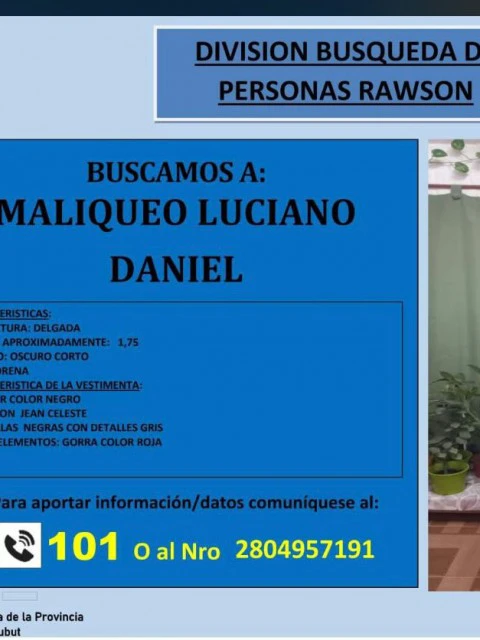 Desde la División Búsqueda de Personas de Rawson solicitaron la colaboración de la comunidad para dar con el paradero del menor de 15 años Maliqueo Luciano Daniel.