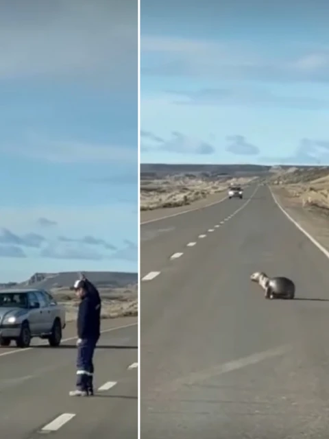 Las imágenes, registradas por otro conductor que filmó con su celular, muestran cómo el transportista desciende del camión para asegurarse de que el animal no corra riesgos y pueda regresar a su hábitat.